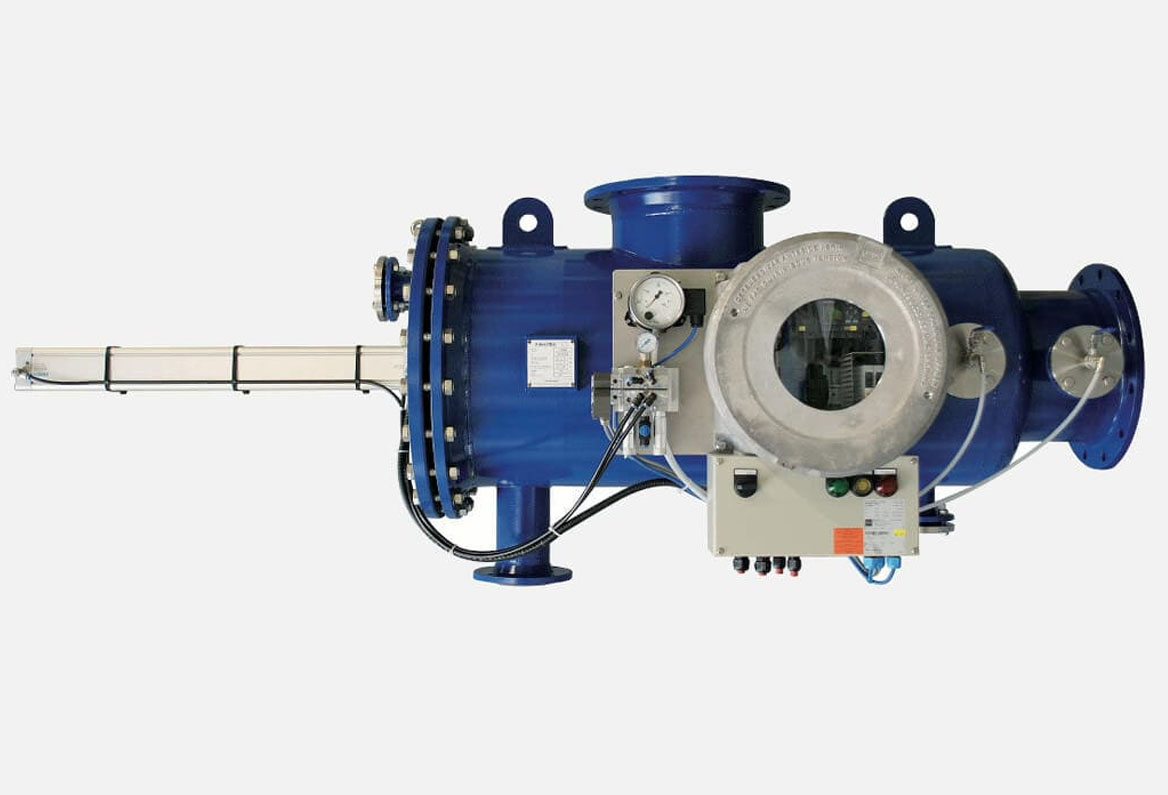 Self-cleaning filter designed to handle large flows, higher pressures & heavy dirt loads. It cleans itself automatically either by sensing pressure drop across the filter, or by timer, whichever occurs earlier.